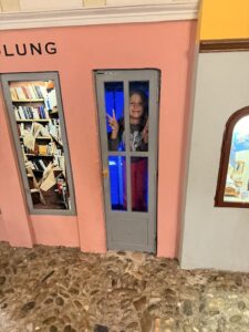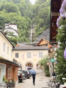 Все домики на узкой улочке были заняты сувенирными магазинами и кафе. Из интересных локальных сувениров можно было найти соль из старинной местной шахты и украшения на елку. В какой-то момент из-за домов по левой стороне показался настоящий водопад. Несмотря на дождик, было очень уютно и невероятно красочно.