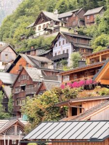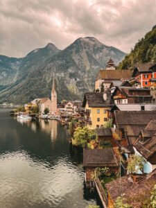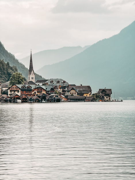 Прямо на въезде в Халльштатт стало сразу понятно, что поселок активно принимает туристов много лет. Нас сразу же встретили электронные указатели на разные парковки с количеством свободных мест. Людей в поселке было много, но как будто меньше обычного с учетом вечернего времени и дождя. Великолепный вид на горное озеро и домики Халльштатта показался быстро, а два лебедя у самого берега дополняли сказочную картину. Но это было еще не тот самый вид, за которым мы приехали, так что мы пошли на поиски через поселок.