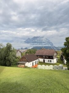 В каком-то меланхоличном настроении мы побрели обратно к машине, уже темнело, и нам пора было ехать к месту ночевки. Это была просто квартира в аренду на booking.com, но из окна и с личной небольшой террасы можно было продолжать любоваться горами. Этому мы и посвятили несколько часов утром, позавтракав на террасе под редкое мычание коровок.