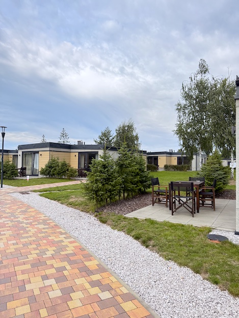 Через час после обеда мы добрались до деревушки аквапарк-комплекса Suntago. Там мы останавливались уже во второй раз, и нам очень понравился формат. Деревушка состоит из 90+ сдвоенных одноэтажных домиков, в которых есть зал с кухонькой, спальня и туалет. У каждого домика есть своя небольшая терраса с грилем. Есть также и большой общий дом, где находится регистратура, магазин и уголок для завтраков. На территории есть большая детская площадка, где летом по вечерам организуют бесплатную анимацию для детей. В это время взрослые могут отдохнуть неподалеку у бара с общим грилем.